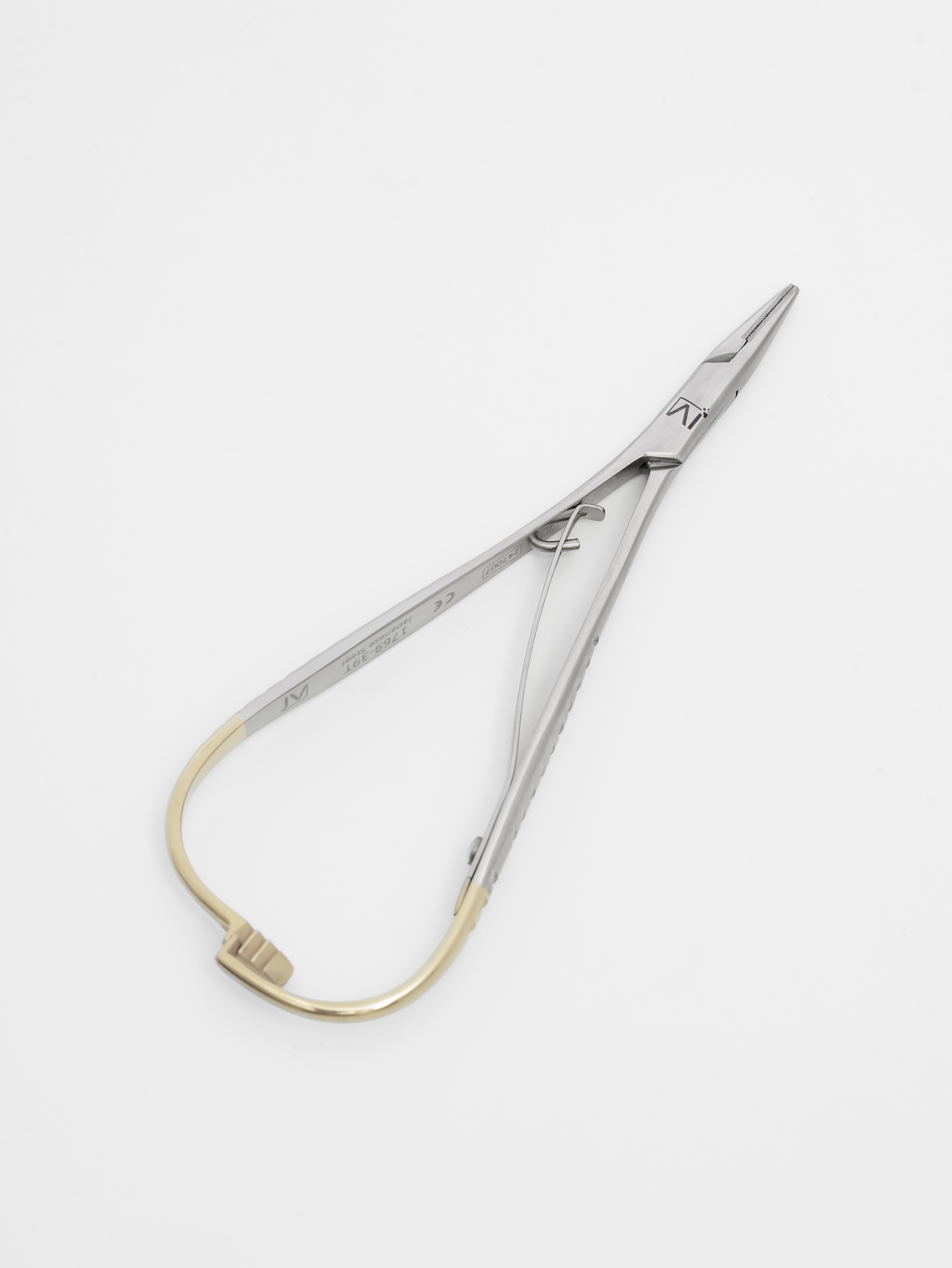 Зажим Мэтью с узкими щечками для работы с металлическими лигатурами.